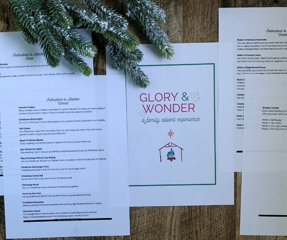 The Glory & Wonder Advent Kit is designed for families to use to celebrate the birth of Jesus. Our goal is to provide you with a product that helps you focus on the meaning of the season, celebrate with your family, and serve others without the stress.